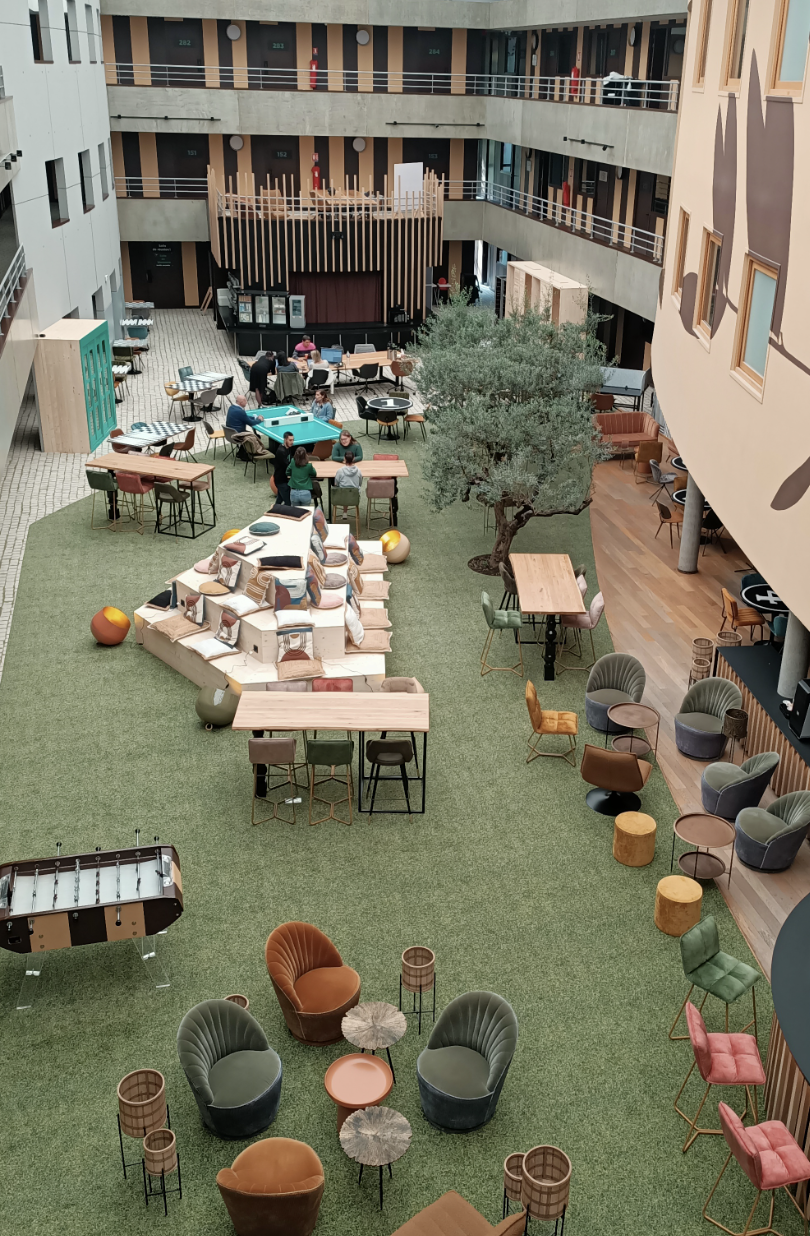 Résidence de Coliving et de Coworking, elle permet aux professionnels de la technopole, aux étudiants des grandes écoles et aux particuliers de passage de se côtoyer sur un seul espace sur lequel tout est possible.