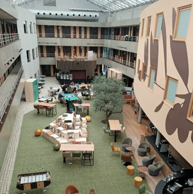 Lieux partagés : L'établissement Cowool Villeneuve d'Ascq dispose aussi d'un bar-salon cosy, d'une estrade accueillant conférences, pauses cafés ou coworkers, et de divers espaces loisir (salle de cinéma, espace santé, boulodrome, salle de gaming...). Son vaste vaste atrium de 700 m², orné de ses magnifiques oliviers centenaires, est aménagé en différents espaces de coworking calmes et lumineux pour une ambiance de travail conviviale et cosy.